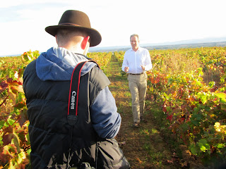 I travelled to one of the RODA vineyards in Augustín's car along with Robert (McIntosh. Conference co-founder, tour organizer, and guide) and two other bloggers. Of course we were treated to a live commentary as we went along. As soon as we disembarked, Augustín launched into a discourse which I will paraphrase (on the basis of Robert's translation). Apparently Augustín uses divining (dowsing) rods for subsurface detection (I assume of water but he did not specify) but a set of recently installed, high-capacity electricity transmission lines were "messing up" his magnetic field. I was honestly more upset by the fact that the relatively ugly structures supporting the lines had despoiled such a beautiful landscape where grape vines had previously stretched out to the hills otherwise unencumbered. I asked whether landowners had fought to prevent this from happening and he looked at me with sympathy. I obviously did not understand how things worked in these here parts. Of course they had protested. But while they were off protesting, the permitting was rushed through by the interested parties and the despoiling structures were erected almost overnight. And they had messed up his magnetic field to boot.